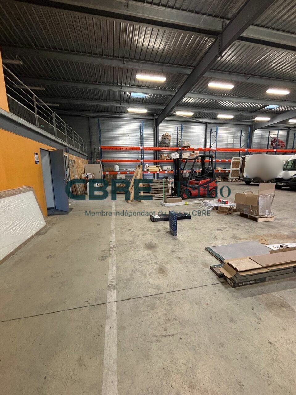 Double vitrage, bureaux cloisonnés avec fibre, 2 portes sectionnelles 4×4.6m, grand parking bitumé avec accès lourd.